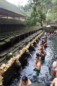 uwięzieni w wioskowej świątyni , mamy okazje posłuchać koncertu przygotowujących się do procesji chłopców , walą w bębny, pokrywy , mosiężne dzwony , czad i tak przez prawie 2 godziny , uzbrojeni w przeciwdeszczowe ubranka , ruszamy dalej , docieramy do Pura Tirta Empul . Została zbudowana w X wieku wokół gorącego źródła , które do dzisiaj bulgoce na dziedzińcu świątyni. Balijczycy przychodzą do świątyni, by odbyć rytualną kąpiel . Przypomina to trochę kąpiel Hindusów w Gangesie , jest bardzo malowniczo, obowiązkowo musimy założyć tradycyjne sarongi (prostokątne chusty osłaniające nogi).
